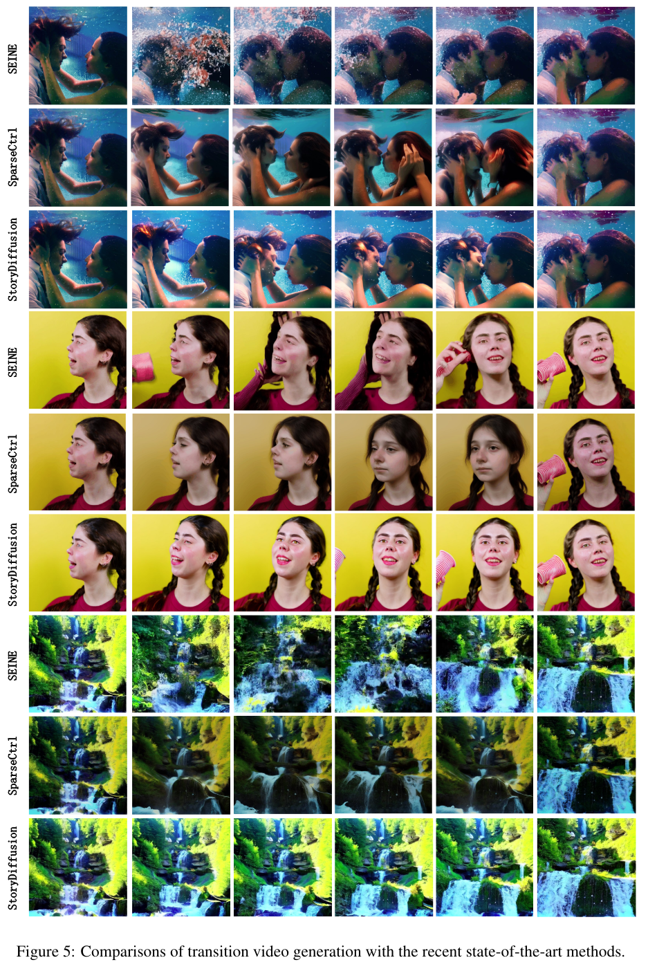 - semantic 공간 속에서 두 이미지 사이의 전환을 예측하는 새로운 모듈인 Semantic Motion Predictor (SMP)를 제안하였다. 이는 최근에 연구된 이미지 조건부 방법인 SEINI 및 SparseCtrl보다 훨씬 더 안정적인 긴 영상 프레임을 생성하여 분 단위로 쉽게 업스케일링 할 수 있다.