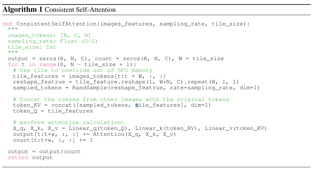 - 학습없이 플러그로 연결 가능한 attention 모듈인 Consistent Self-Attention (CSA)을 제안하였다. 이는 높은 텍스트 제어력을 가진 스토리텔링을 위해 생성된 이미지 시퀀스 속에서 일관된 캐릭터를 유지할 수 있게 한다.