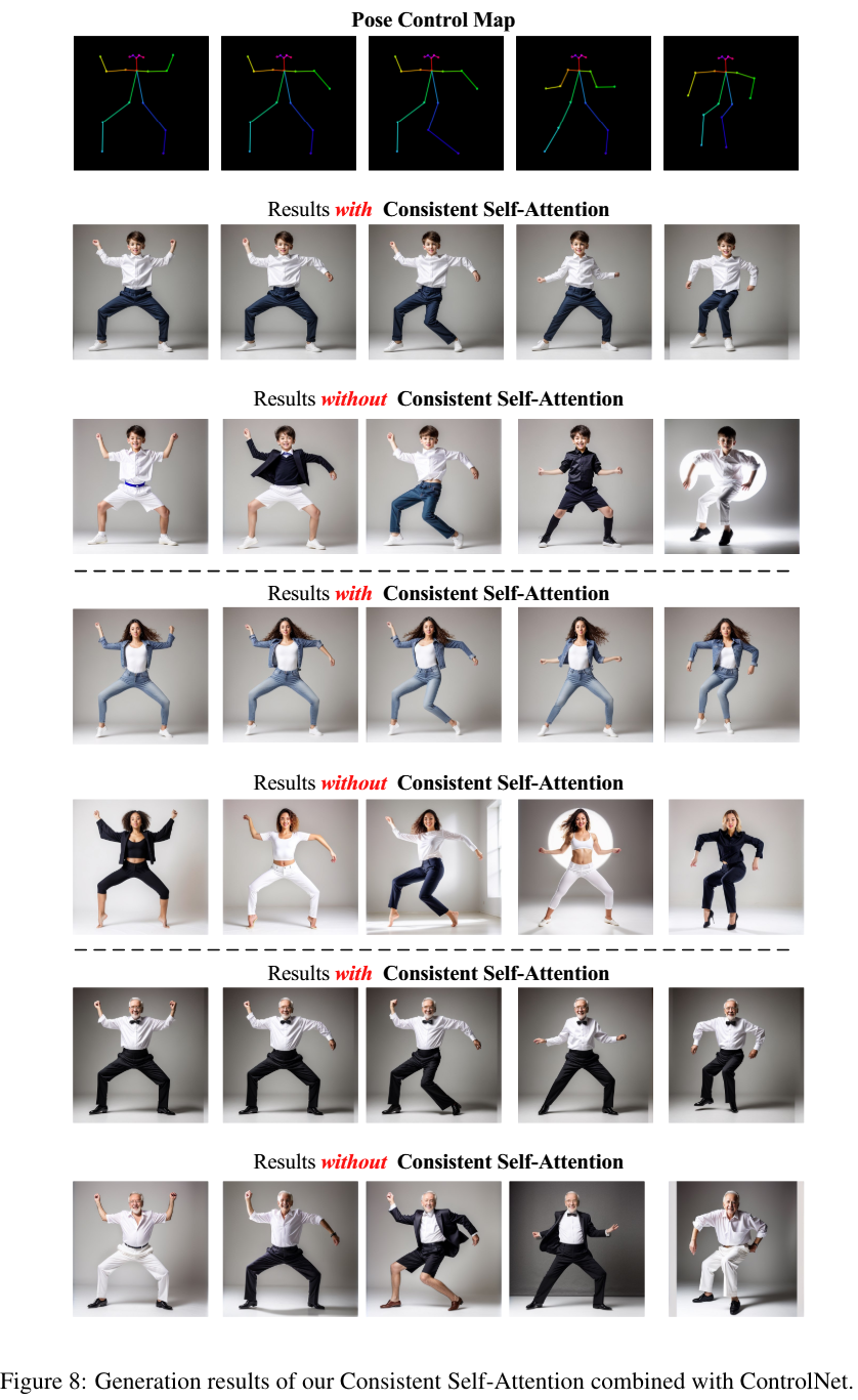 페어 토큰이 주어지면, 저자의 방법론은 이미지 배치 전체에서 self-attention을 수행하여 서로 다른 이미지의 feature 간의 상호작용을 촉진한다. 이러한 유형의 상호작용은 생성 과정에서 캐릭터, 얼굴, 복장이 융합되도록 모델을 촉진한다. 심플하고 학습이 필요없지만 CSA는 효과적으로 일관된 피사체를 생성할 수 있다.