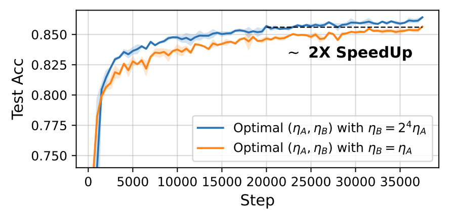 본 논문에서는 LoRA에서 Matrix B, A에 같은 Learning rate를 사용하는 것은 효율적이 않다고 주장하였다. 그러면서 간단한 방법으로 learning rate를 다르게 설정하는 LoRA+를 제안하였다. 이는 같은 컴퓨팅 자원에서 LoRA 대비 1~2%pt의 성능 향상과 약 2배까지의 속도 향상이 가능하다고 주장한다.